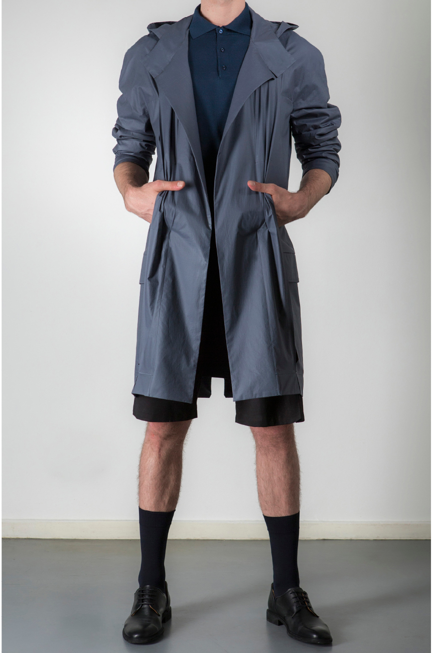 Trenchcoat „Michael“ mit Kapuze aus gewachster 100% Baumwolle aus Italien, durch raffinierte Vorderfalte verdeckte kleine Seitentaschen, große Fronttaschen mit versetzter Norfolkfalte, Rückenpasse, teilweise mit Viskose gefüttert. Der sportlich- elegante All-Rounder für die Übergangszeit.